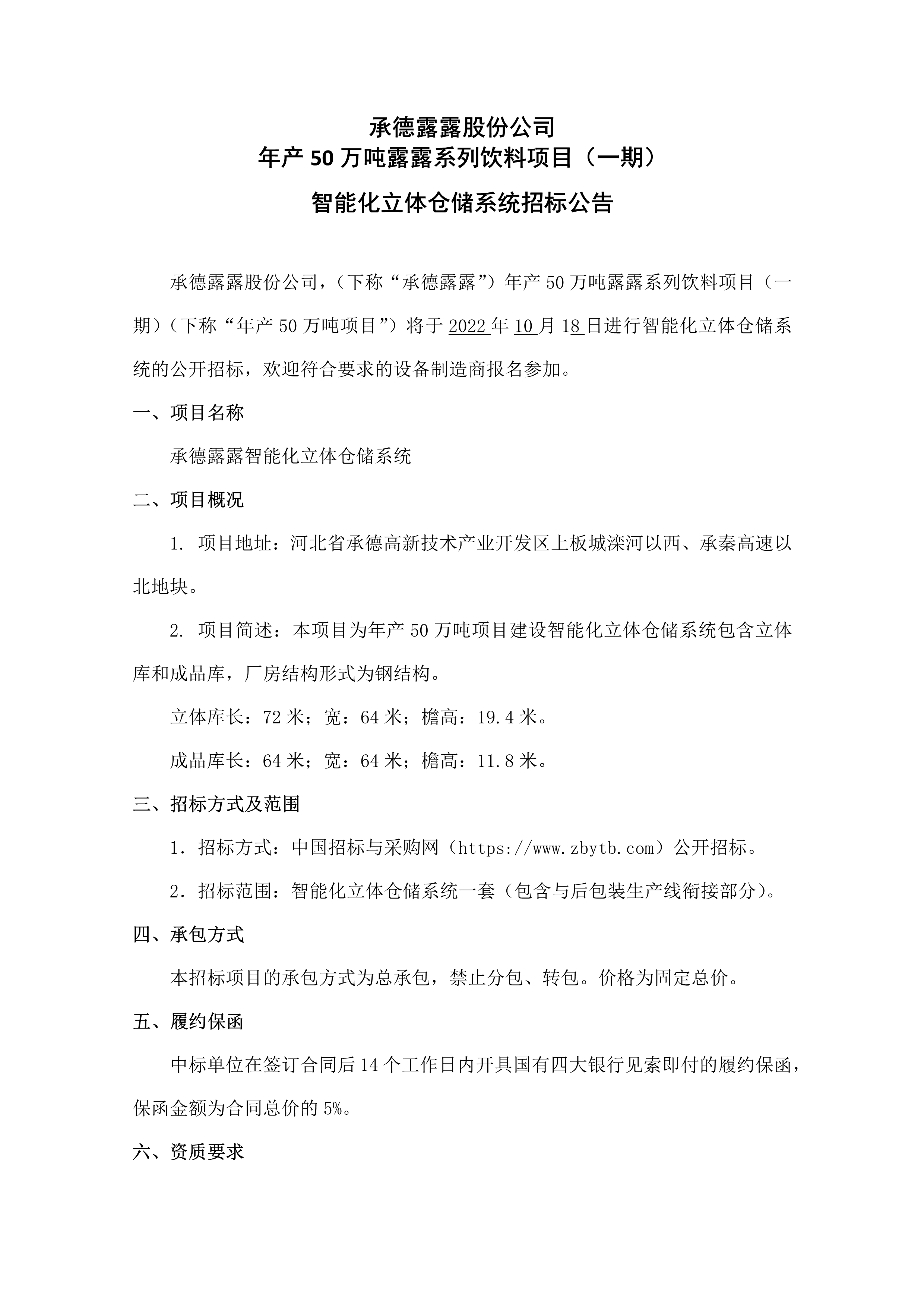 承德露露股份公司年產50萬噸露露系列飲料項目(一期)智能化立體倉儲系統招標公告